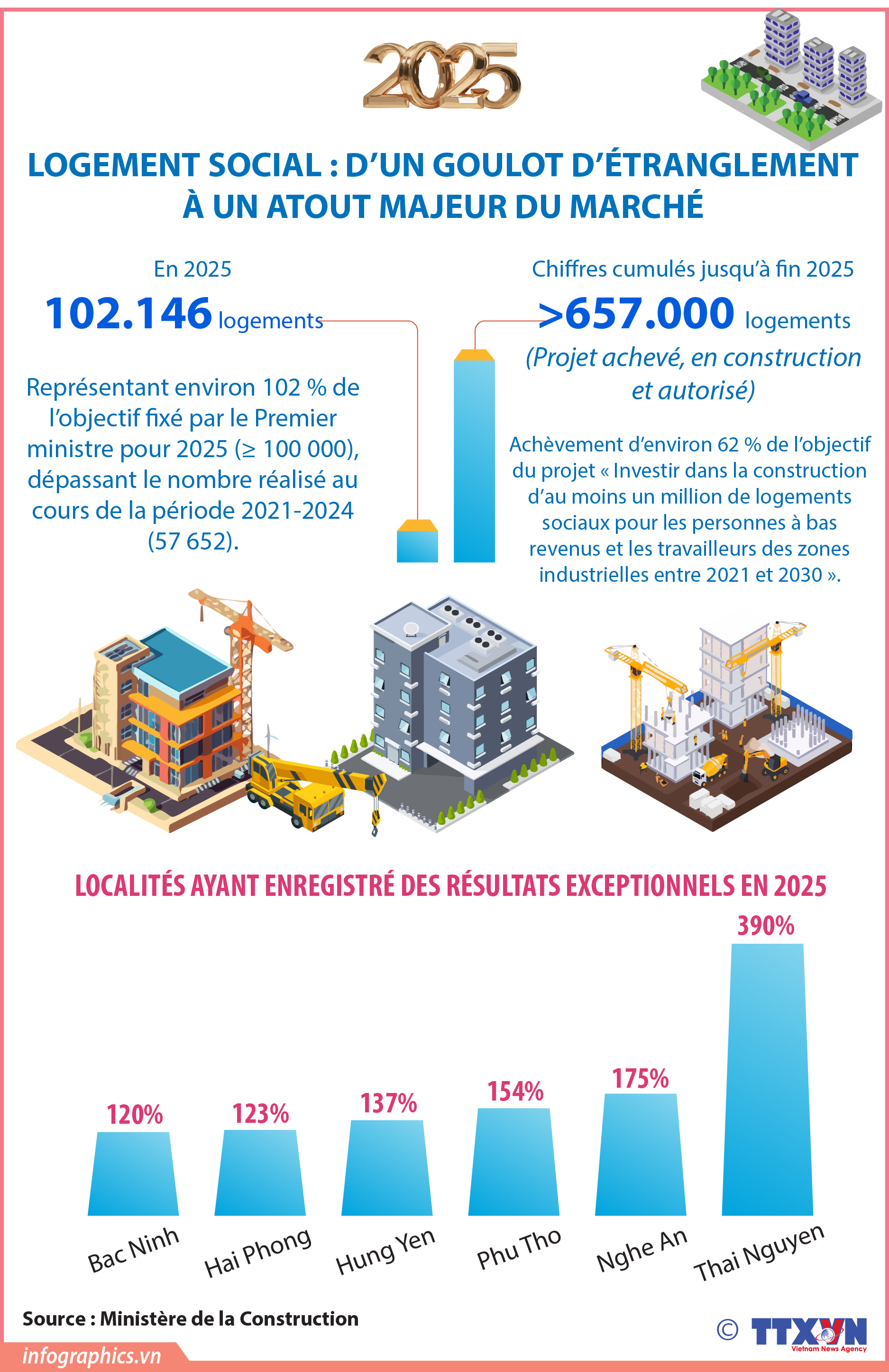 Le développement du logement social en 2025 a enregistré des avancées nettes. De nombreuses localités ont accéléré le rythme et atteint leurs objectifs. À la fin de l’année 2025, l’ensemble du pays avait construit 102 146 logements sociaux, soit 102 % de l’objectif fixé pour 2025 par le Premier ministre.