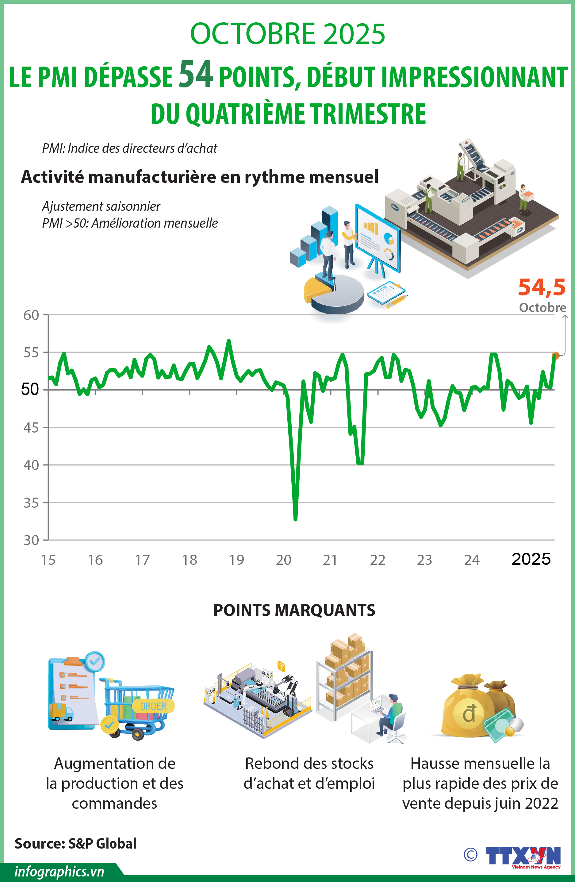 L'indice des directeurs d'achat (PMI) du secteur manufacturier vietnamien a atteint 54,5 points en octobre, signalant une hausse mensuelle la plus forte depuis juillet 2024.